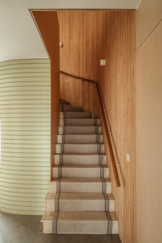 A corrugated silo structure conceals the stairs