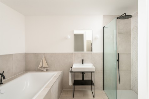 Shared by rooms two and three, this spacious bathroom includes a deep soaking tub, invigorating separate shower with rainfall option, modern sink, sleek WC, and a heated towel rail.