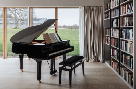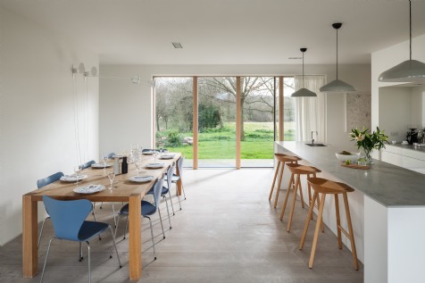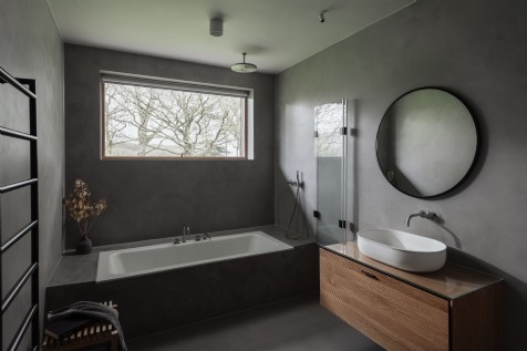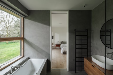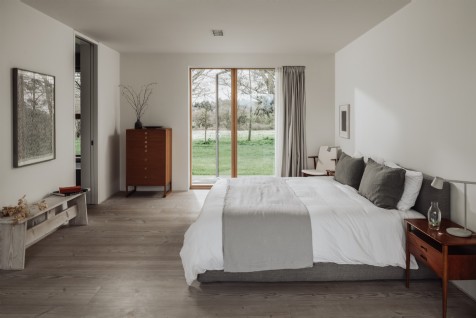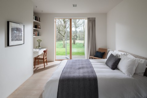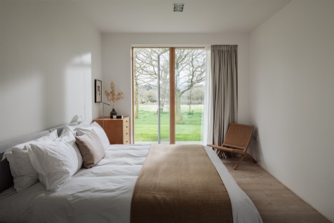 The main bedroom, with its glorious lawn views and Scandi design, has a super king-size bed and en suite with bath, rainfall shower, and WC.