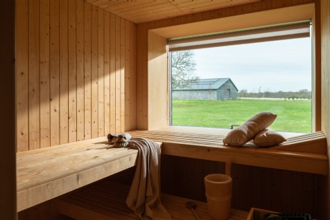 The indoor sauna overlooks flatlands, and has an adjoining shower