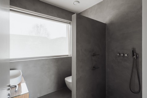 The concrete family bathroom is shared by bedrooms two and three, and contains a built-in bath with handheld shower attachment, rainfall shower, and WC.