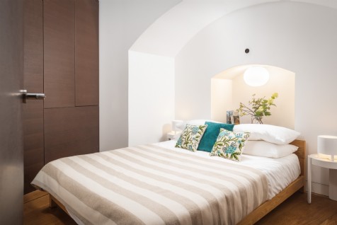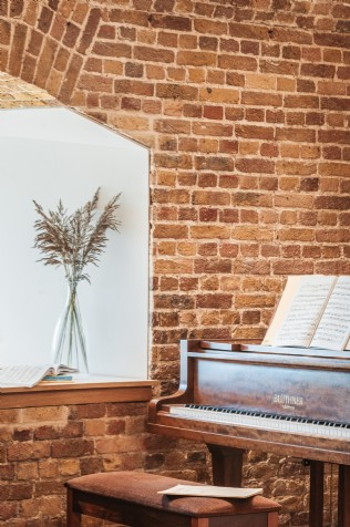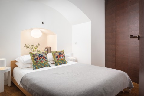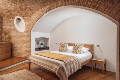 The master bedroom sits on the ground floor beside one of the two family bathrooms. This stylish sleeping space includes a super king-size bed along with circular pipes which let the natural light flood through the fortress’s three-metre brick walls.