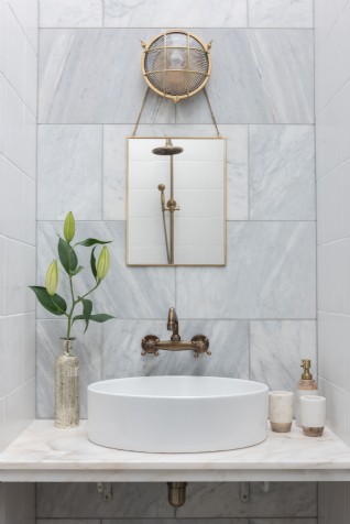 The family bathroom on the first floor is a calming space with bath and walk-in shower.