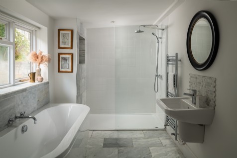 At the top of the stairs you'll find the king-size bedroom, which shares the family bathroom complete with bathtub overlooking the garden and a separate walk-in shower.
