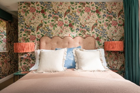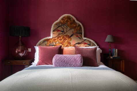 The master bedroom includes a super king-size bed and en suite with pink art deco style bath and separate rainfall shower.