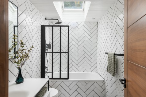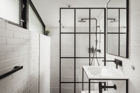 The monochromatic family shower room features a spacious shower with unique square showerhead.