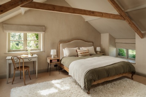 The generous master suite has a king-size bed, original beams and plastered walls. Through glass-panelled doors, there's a statement bathroom suite with a copper Catchpole & Rye bathtub, rainfall shower, WC and original mill features.