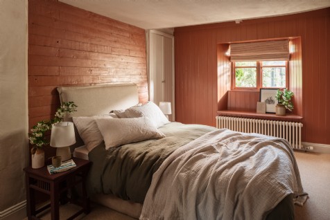 The third bedroom, with double bed and terracotta wood-clad walls, has a ladder taking you up to a mezzanine spill-out space. This bedroom makes use of the first-floor family bathroom.
