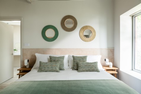 The second bedroom, with its bright interiors and external door that opens to steps down to the garden, has a zip-and-link super king or twin bed and en suite with a bath, walk-in shower, and WC.