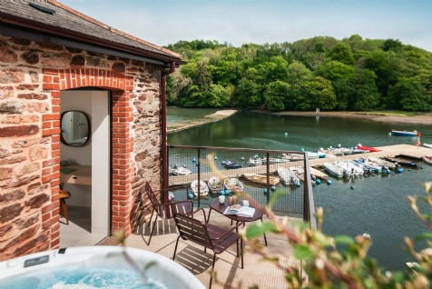 The main bedroom, with treble-aspect windows, views over the River Dart, and decking area with a hot tub, has a super king-size bed and en suite with walk-in rainfall shower, two sinks, and WC.