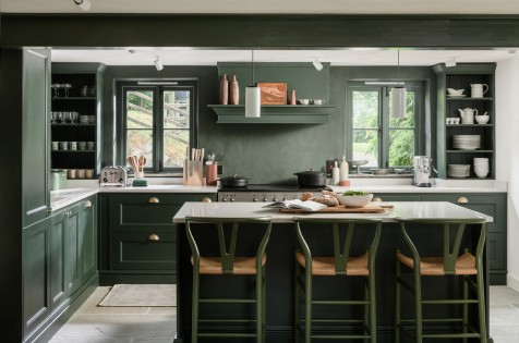 Sip wine and pass the time in the olive green kitchen with stone counters.