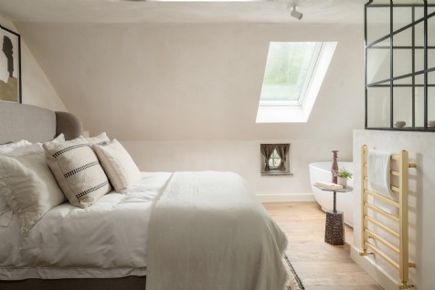The main bedroom, with views over the garden, has a king-size bed, free-standing bath, walk-in rainfall shower, and WC.