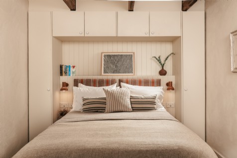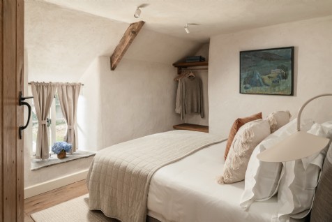 This snug bedroom has a luxurious upholstered king-size bed and an en suite with walk-in rainfall shower (with handheld attachment) and WC.