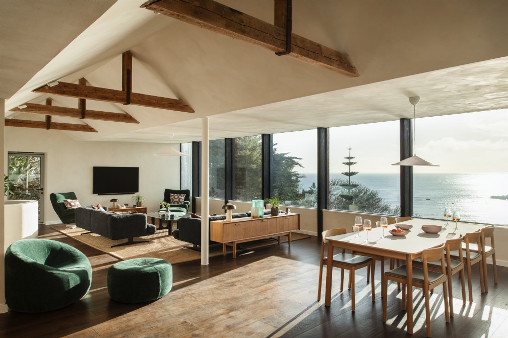 Where Coverack's ancient contours trace the boundary between Earth's mantle and crust, Old Pine stands sentinel. Following a sensitive restoration, this luxury self-catering retreat honours its location through design – charred timber retains the patina of time, interiors refract coastal light, and terraced gardens cradle a hot tub and fire pit. Sweeping sea views flood the living spaces above, whilst below, a yoga room, cinema snug and cocktail room ground with an earthen warmth.