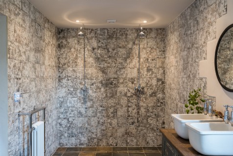 The spacious ground floor wet room features a double shower, his-n-hers sinks, and a deep freestanding bath made for relaxing.