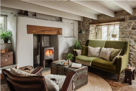 A wood-burner crackles in the cosy cottage living room