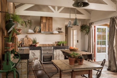 Rusticity reigns in the open plan kitchen, dining and second sitting room