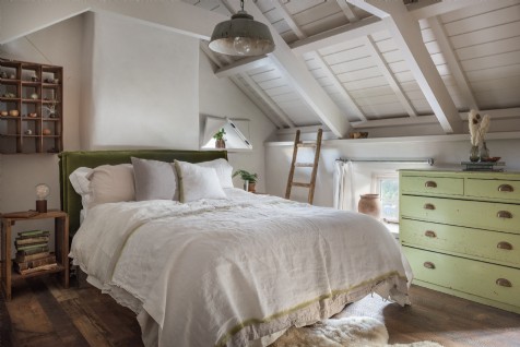The luxurious double bedroom with sumptuous king-size bed, wooden beams and quirky features nestles in the rafters.