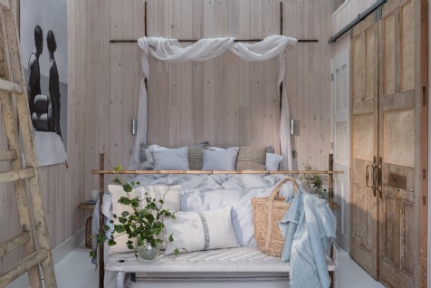 A small set of steps separate the double bedroom with king-size bed from the rest of the house