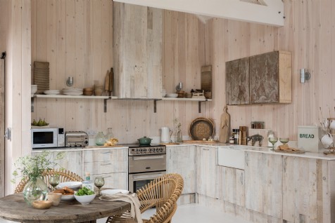 Rustic white-washed kitchen at The Cotton Tree in Holywell Bay