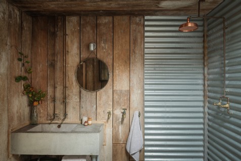 The tin, concrete and wood-clad bathroom features a custom-built bath and sink, with a wet-room style rainfall shower.