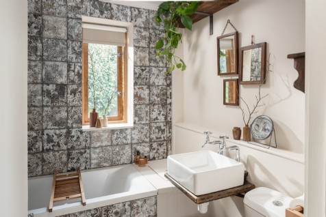 The family bathroom features a bath with overhead shower, sink and WC. Mandarin stone tiles add an artisan edge.
