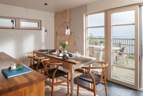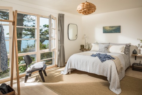 This bedroom on the first floor features a comfortable double bed, floor to ceiling windows with sea views and an en suite bathroom with overhead shower.